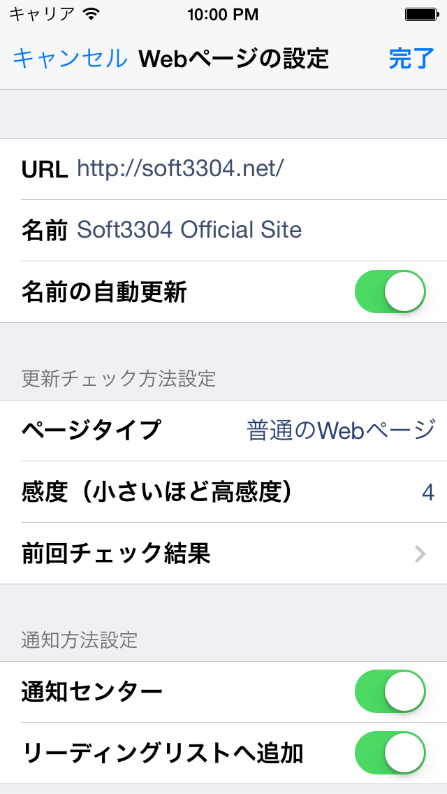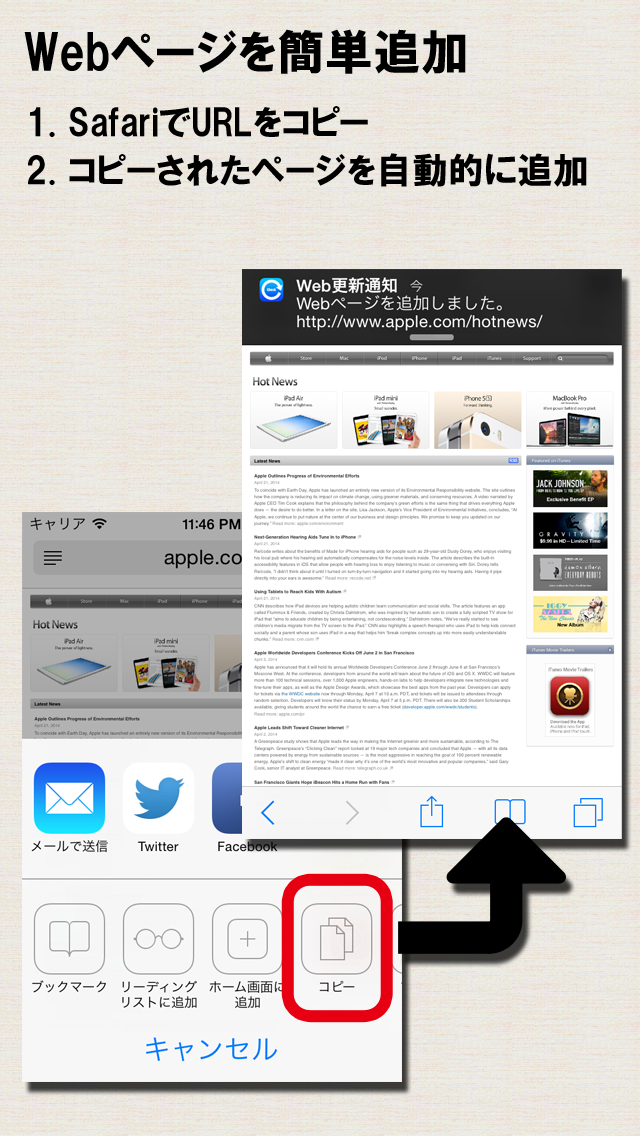 Webページの更新を自動的にチェックしてお知らせします。 Safariのリーディングリストと連携できるので、更新されたページをオフラインで読む事も可能です。